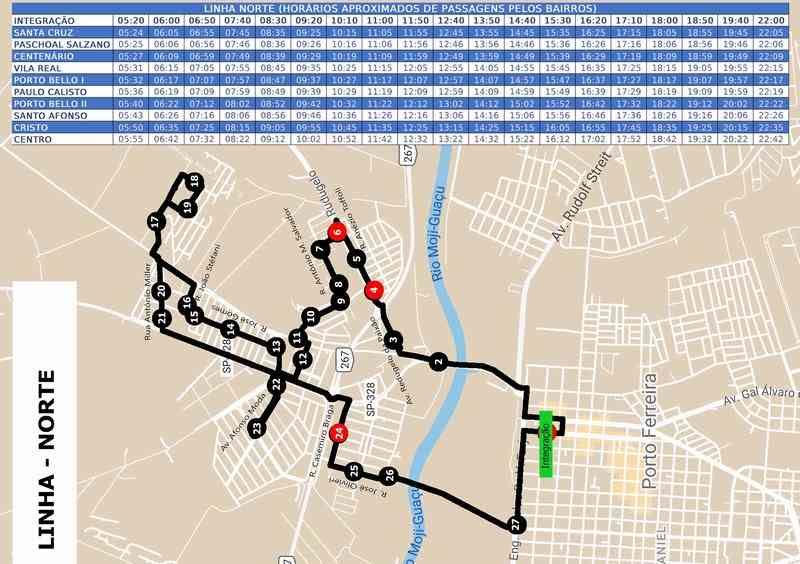 Assim, com o aumento do percurso das linhas e do tempo para percorrê-las, ocorrerão pequenas mudanças nos horários de partida do ponto de integração, localizado na praça Cornélio Procópio (Centro), conforme se observa abaixo nas ilustrações dos novos percursos das linhas Sul e Leste e tabela com os novos horários de todas as linhas.