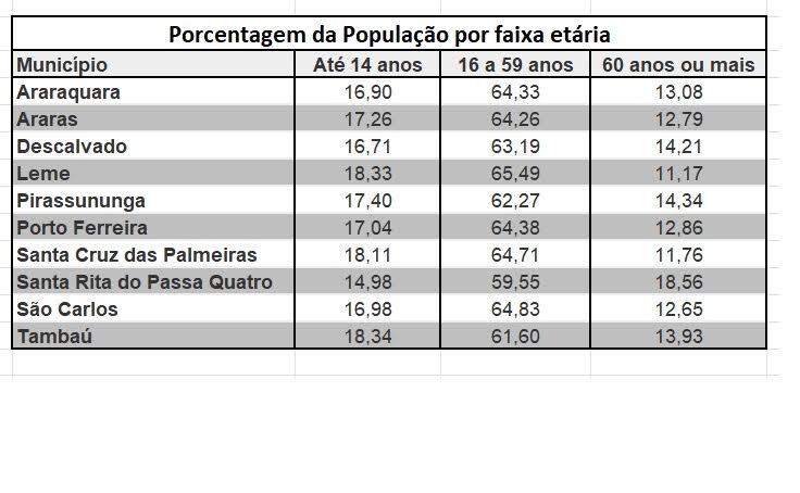 Entre os municípios da nossa microrregião – Araraquara, Araras, Descalvado, Leme, Porto Ferreira, Pirassununga, Santa Cruz das Palmeiras, Tambaú e Santa Rita do Passa Quatro, essa última é o que tem maior proporção de idosos, com 18,56% da sua população com mais de 60 anos, superando em pouco mais de 3% a população de crianças até 14 anos (14,98%)