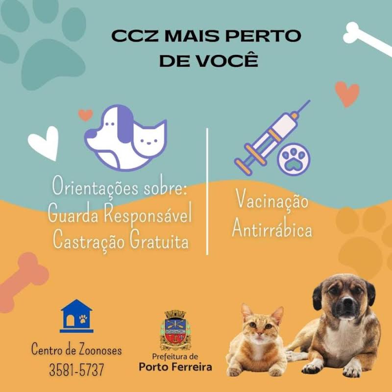 Dando continuidade ao Projeto CCZ MAIS PERTO DE VOCÊ, o Centro de Controle de Zoonoses de Porto Ferreira estará no mês de novembro em diferentes bairros do munícipio, orientando sobre o mutirão de castração, entregando fichas/senhas e atualizando a vacinação antirrábica dos animais inscritos para o programa de controle populacional gratuito.