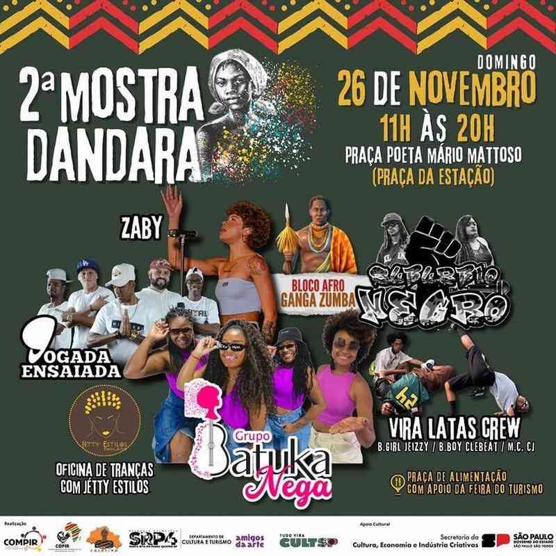 A “2ª MOSTRA DANDARA” que tem como objetivo a valorização da Cultura e o fomento da Economia Criativa Afro-brasileira do município e região acontecerá no dia 26 de novembro (domingo) das 11h00 às 20h00 na Praça Poeta Mario Mattoso (Estação)