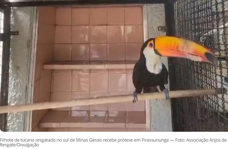Um filhote de tucano resgatado com o bico quebrado no Sul de Minas Gerais recebeu uma prótese em uma clínica de Pirassununga (SP) e está de bico novo.