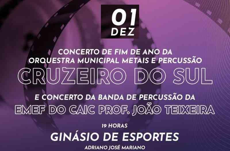 A Orquestra Municipal Metais e Percussão Cruzeiro do Sul de Porto Ferreira realizará nesta sexta-feira (01/12) um concerto de fim de ano aberto ao público. O evento terá início às 19 horas, no Ginásio de Esportes Adriano José Mariano, no Centro.