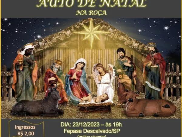Com o apoio da Prefeitura de Descalvado, através da Secretaria de Educação e Cultura (SEEC) e, apoio cultural da Rádio Regional FM 98.7, o Grupo Teatral RAE (Raízes, Arte e Expressão) fará no sábado, dia 23, a apresentação “Auto de Natal na Roça”, a partir das 19h, no Antigo Cinema da FEPASA.