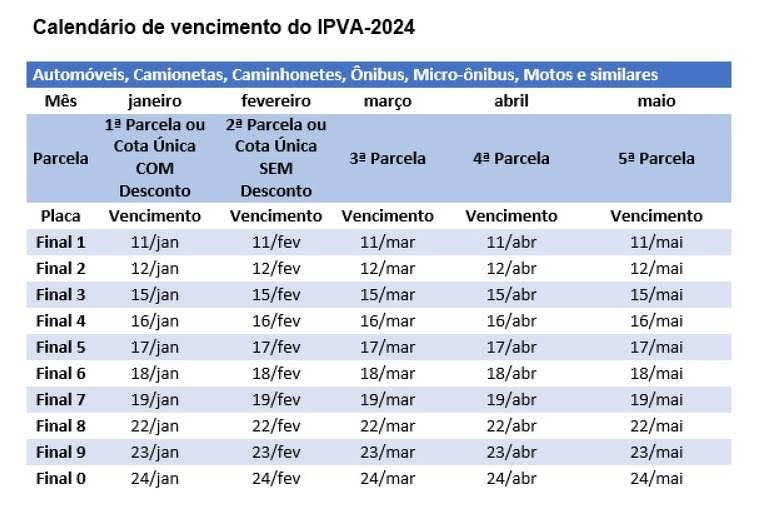 Confira na imagem, do topo da reportagem, a tabela com os vencimento do IPVA 2024 de acordo com o final da do veículo