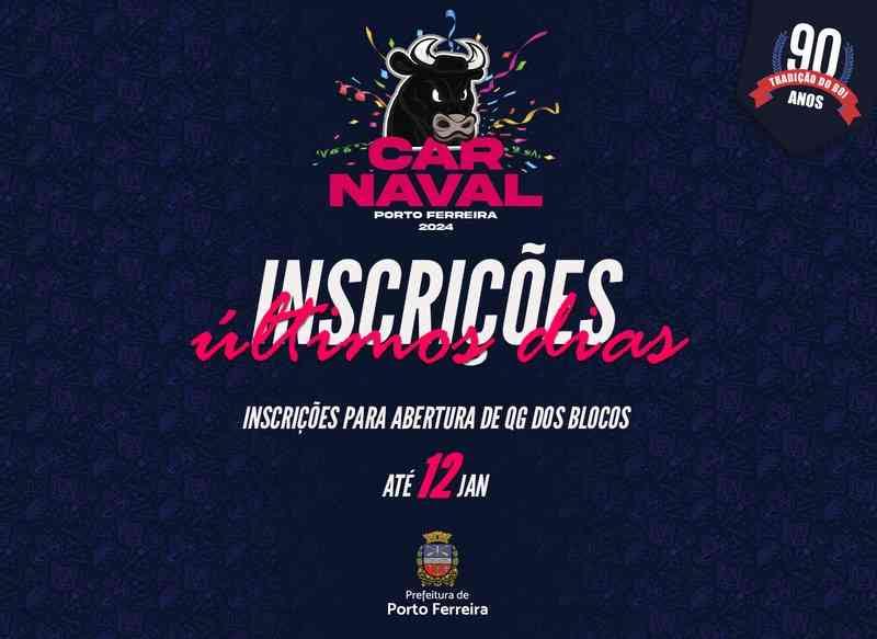 A Secretaria de Cultura e Economia Criativa da Prefeitura de Porto Ferreira informa os últimos dias para as inscrições visando a abertura dos QGs dos blocos carnavalescos para o aguardado Carnaval 2024. Este ano reveste-se de significado especial, pois marca os 90 anos de tradição do Boi na cidade.