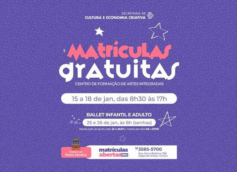 A Secretaria de Cultura e Economia Criativa de Porto Ferreira anuncia a abertura das inscrições para mais de 320 vagas em cursos do Centro de Formação de Artes Integradas em 2024. Com uma oferta diversificada, os cursos abrangem música, teatro, dança e artes plásticas.