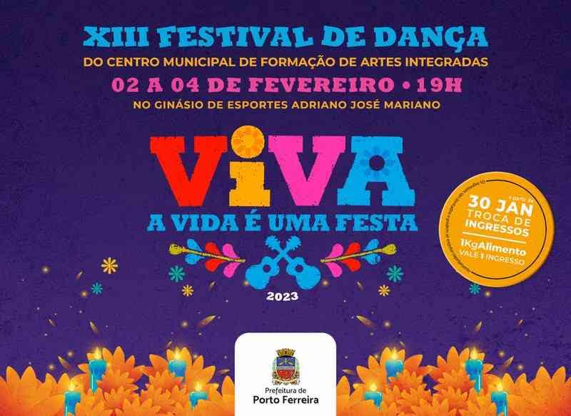 O Centro Municipal de Formação de Artes Integradas, vinculado a Secretaria de Cultura e Economia Criativa, anuncia a realização do tão aguardado XIII Festival de Dança, que foi adiado de novembro de 2023 para os dias 2 a 4 de fevereiro de 2024. O evento acontecerá no Ginásio de Esportes Adriano José Mariano, a partir das 19 horas em todos os dias.