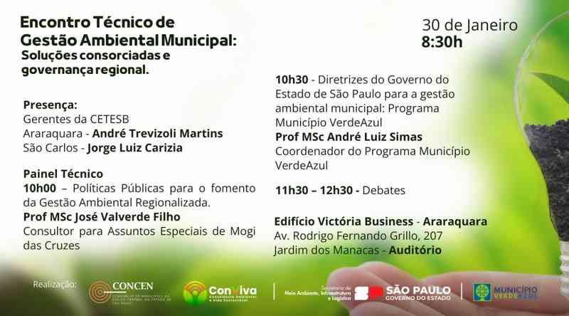 O Encontro será realizado em Araraquara no próximo dia 30 de janeiro e tem como objetivo principal apresentar as diretrizes do Programa Município VerdeAzul, buscando incentivar a participação ativa dos municípios, esclarecer dúvidas e promover um debate construtivo sobre as ações municipais em prol da agenda do Meio Ambiente.