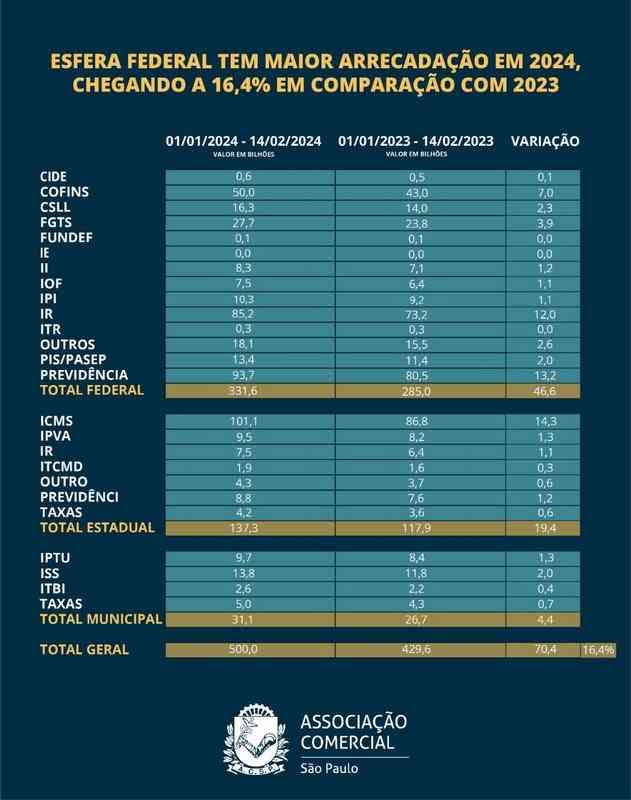 No mesmo período de 2023, a marca alcançada foi de R$ 429,6 bilhões, sendo R$ 285 bilhões à esfera Federal, R$ 117,9 bilhões para a esfera Estadual e R$ 26,7 bilhões referentes à esfera Municipal.
