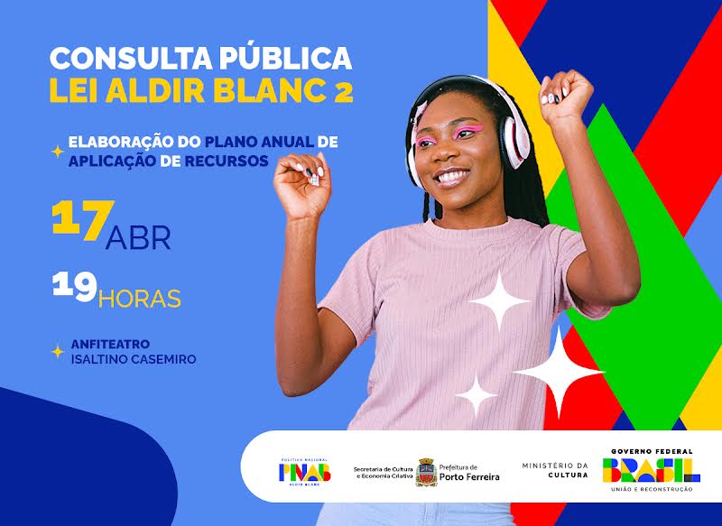 A Secretaria de Cultura e Economia Criativa de Porto Ferreira realizará uma consulta pública nesta quarta-feira (17/04), a partir das 19 horas, no Anfiteatro Isaltino Casemiro. O evento tem como objetivo elaborar o Plano Anual de Aplicação de Recursos da Lei Aldir Blanc 2 e será aberto a toda população ferreirense.