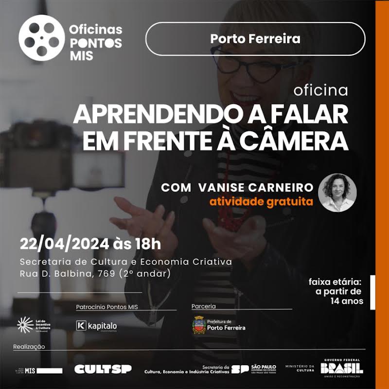 A Secretaria de Cultura e Economia Criativa de Porto Ferreira, em parceria com o projeto Pontos MIS, do Museu de Imagem e do Som de São Paulo, oferecerá a oficina “Aprendendo a falar em frente à câmera”. O evento será realizado na sede da Secretaria de Cultura, localizada na rua Dona Balbina, 769, no segundo andar (antigo Vila Rica Magazine), Centro.