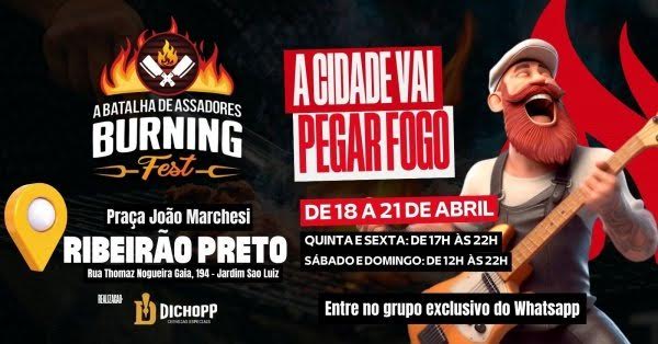 Com entrada de graça, o “Burning Fest” acontece na praça João Marchesi, na rua Thomaz Nogueira Gaia, no bairro Jardim São Luiz, na zona Sul da cidade. O evento será na quinta e sexta-feira, das 17h às 22h e no sábado e domingo, das 12h às 22h.