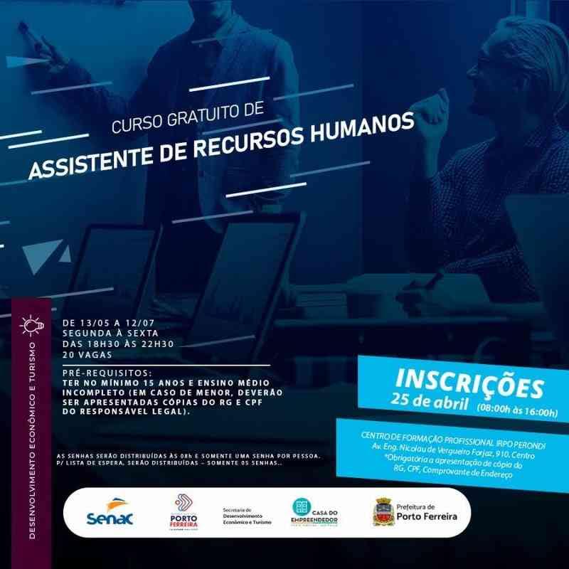 A Prefeitura de Porto Ferreira, em parceria com o Senac (Serviço Nacional de Aprendizagem Comercial), por intermédio da Secretaria de Desenvolvimento Econômico e Turismo, oferece vagas para o curso de Assistente de Recursos Humanos, totalmente gratuito.