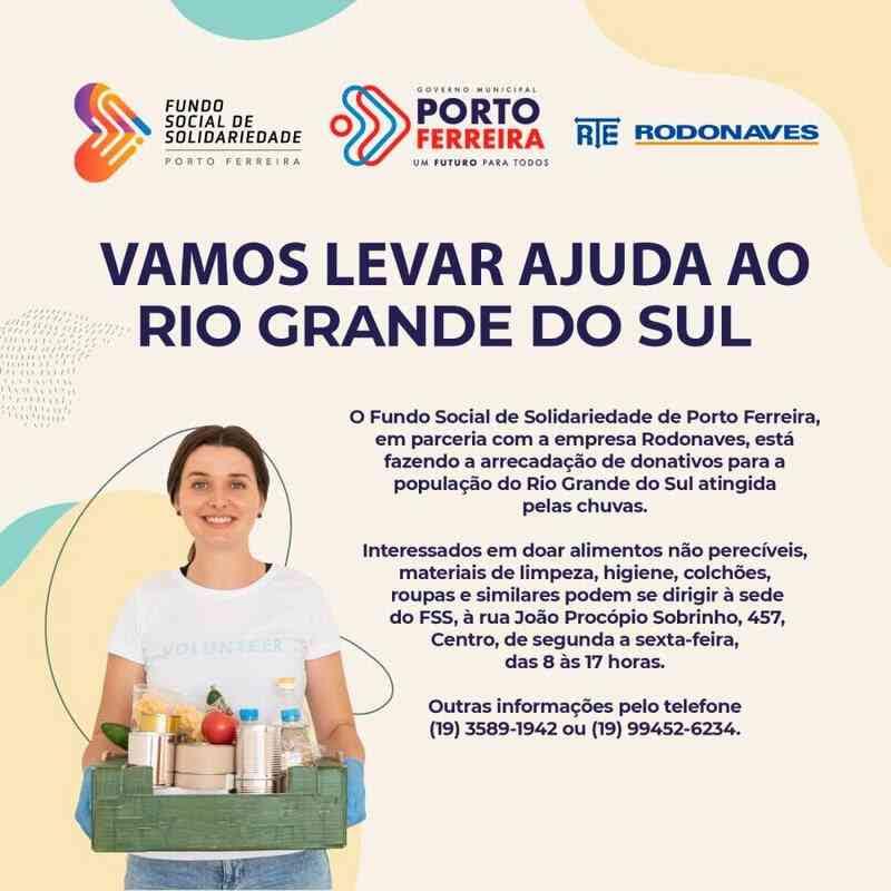 O Fundo Social de Solidariedade de Porto Ferreira, em parceria com a empresa Rodonaves, está fazendo a arrecadação de donativos para a população do Rio Grande do Sul atingida pelas chuvas.