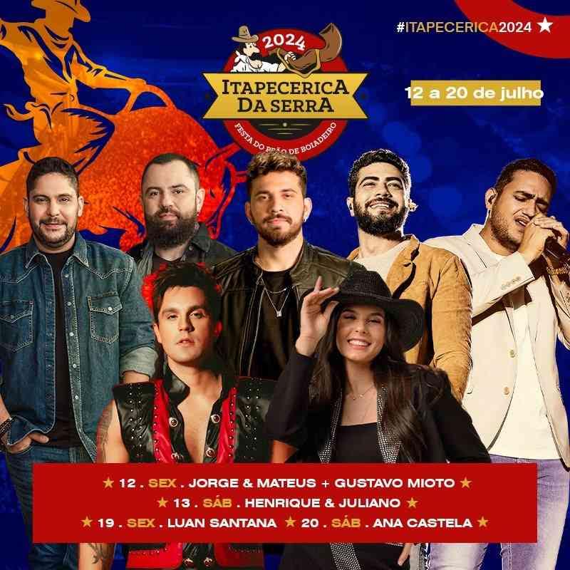 A festa vai começar no dia 12 de julho com o show da aclamada dupla Jorge & Mateus e do cantor Gustavo Mioto. No dia 13, quem sobe ao palco são os irmãos Henrique & Juliano que prometem um grande show. O segundo final de semana tem a apresentação do cantor Luan Santana no dia 19, e da “Boiadeira”, Ana Castela, no dia 20. Nos próximos dias serão anunciados o link e os pontos de vendas para a compra de ingressos.