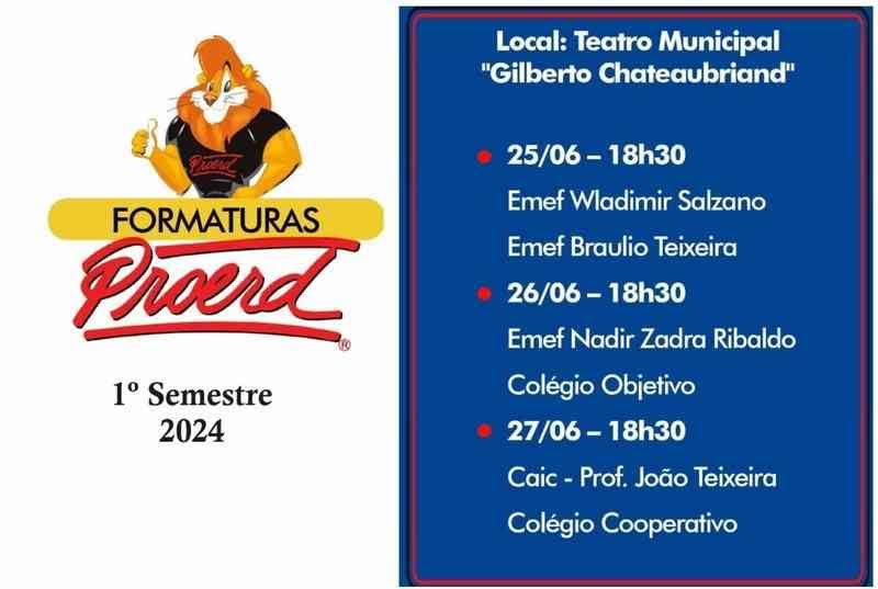 Neste ano uma excelente novidade, as formaturas serão divididas em três dias e serão realizadas no recém inaugurado Teatro Municipal "Gilberto Chateaubriand", uma oportunidade para que as crianças e seus familiares conheçam o novo Teatro. As formaturas acontecerão de duas e duas escolas que participaram do programa e também como forma de integração dos estudantes do nosso município.