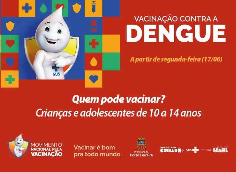 A partir de segunda-feira (17/06) tem início em Porto Ferreira a vacinação contra a dengue. Nesta etapa, o imunizante é destinado a jovens entre 10 e 14 anos de idade e o esquema vacinal é composto de duas doses, com intervalo de 3 meses entre elas, sendo que para se vacinar a criança ou adolescente não pode ter tido a doença nos últimos 6 meses.
