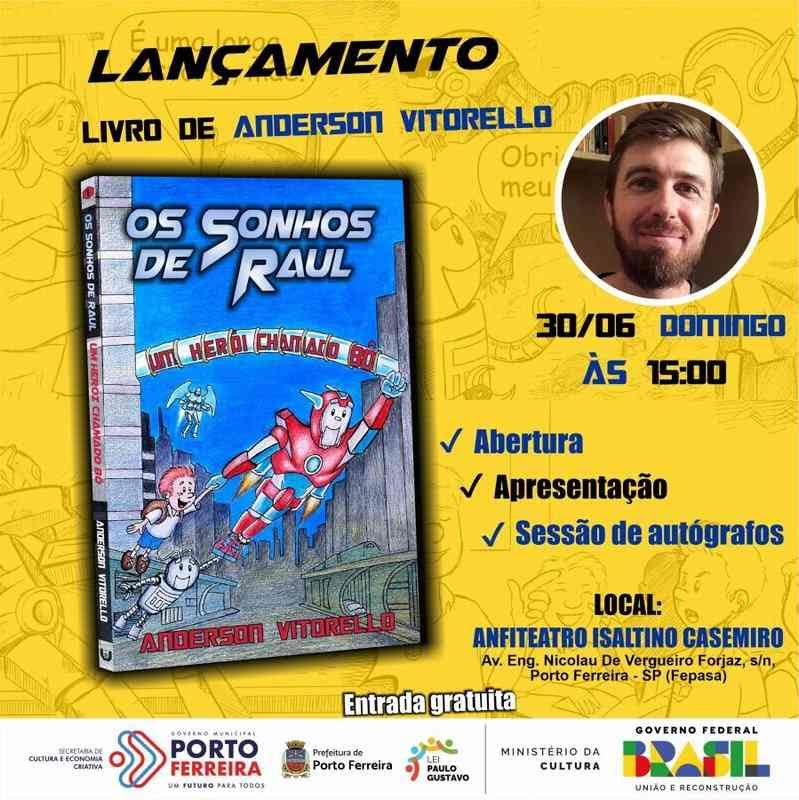 A Secretaria de Cultura e Economia Criativa de Porto Ferreira tem o prazer de anunciar o lançamento do livro “Os sonhos de Raul – Um herói chamado Bô”, escrito pelo agente cultural Anderson José Vitorello. Esta obra, contemplada com recursos da Lei Complementar 195/2022 (Lei Paulo Gustavo), foi aprovada no Edital 01/2023 e oficializada pelo Termo de Execução Cultural nº 11/2023.
