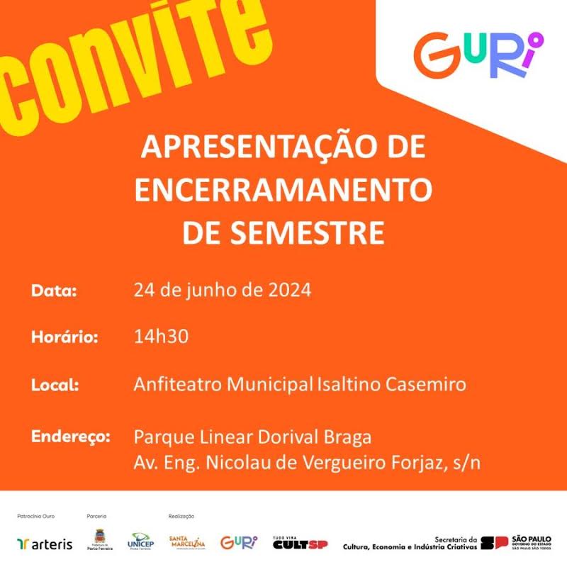 O Polo do Guri em Porto Ferreira realizará na segunda-feira (24/06) a cerimônia de encerramento do primeiro semestre de 2024. O evento será realizado no Anfiteatro Isaltino Casemiro, localizado no Parque Linear Dorival Braga, e contará com apresentações dos alunos das modalidades de Violão, Viola Caipira, Percussão e Canto Coral.