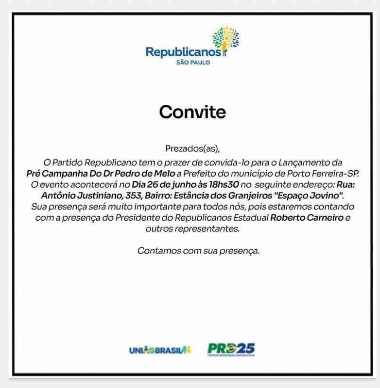 Partido Republicano convida os apoiadores e militantes da pré candidatura a prefeito de Porto Ferreira do Dr. Pedro Melo, a qual será realizada hoje, a partir das 18h30 no espaço Jovino, localizado a Rua Antônio Justiniano nº 353 – Estância dos Granjeiros.