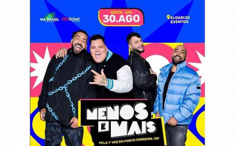 Pela primeira vez na cidade, o grupo de pagode Menos é Mais irá levar à Porto Ferreira o melhor do pagode, com sucessos que prometem animar a noite e fazer todo mundo cantar junto. O show está marcado para o dia 30 de agosto, às 21h00, no Elgarijo Eventos. Marque na sua agenda, as vendas dos ingressos começam em 15 de julho às 18 horas. Compre on-line no site www.redticket.com.br.