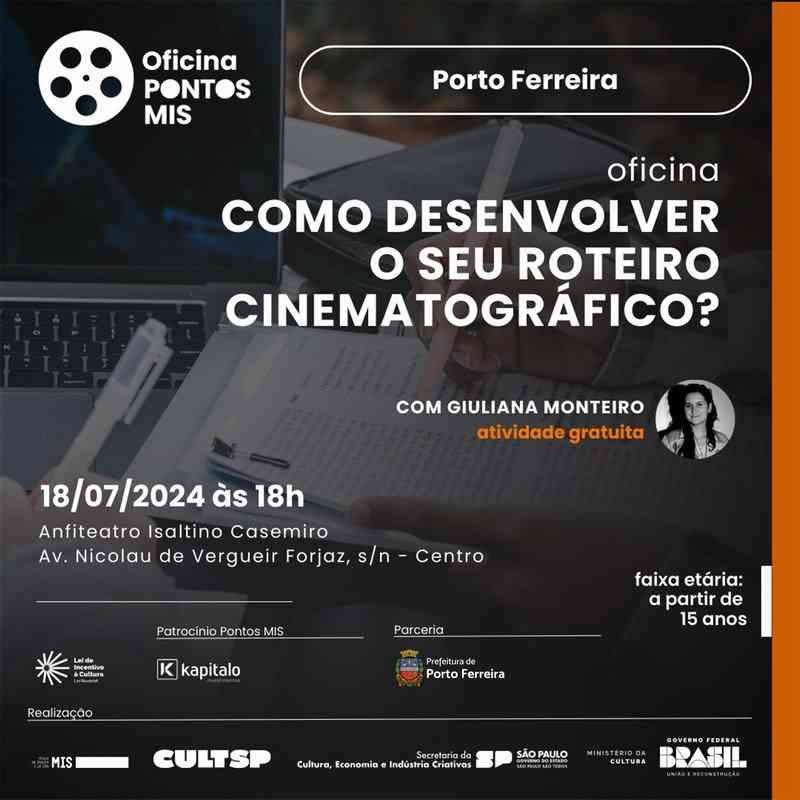 Porto Ferreira será palco de mais uma enriquecedora oficina gratuita promovida pelo Pontos MIS, em parceria com a Secretaria de Cultura e Economia Criativa do município. O tema desta edição é “Como desenvolver o seu roteiro cinematográfico?”, e será ministrada pela roteirista e diretora Giuliana Monteiro.