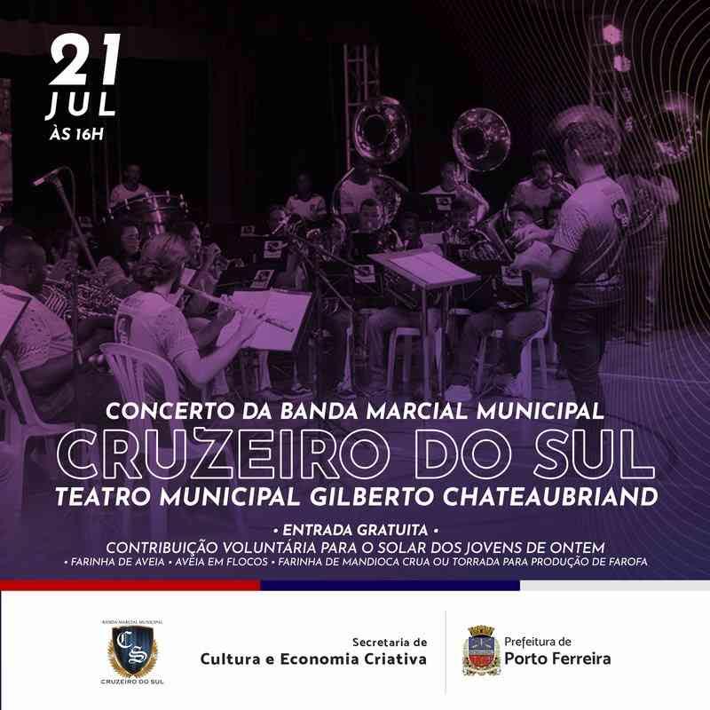 A Secretaria de Cultura e Economia Criativa de Porto Ferreira tem o prazer de anunciar o concerto de fim de semestre da Banda Marcial Municipal Cruzeiro do Sul, que acontecerá no domingo (21/07), a partir das 16 horas. O evento será realizado no Teatro Municipal Gilberto Chateaubriand, localizado na rua São Sebastião, 324, no Centro, com entrada gratuita para todo o público.