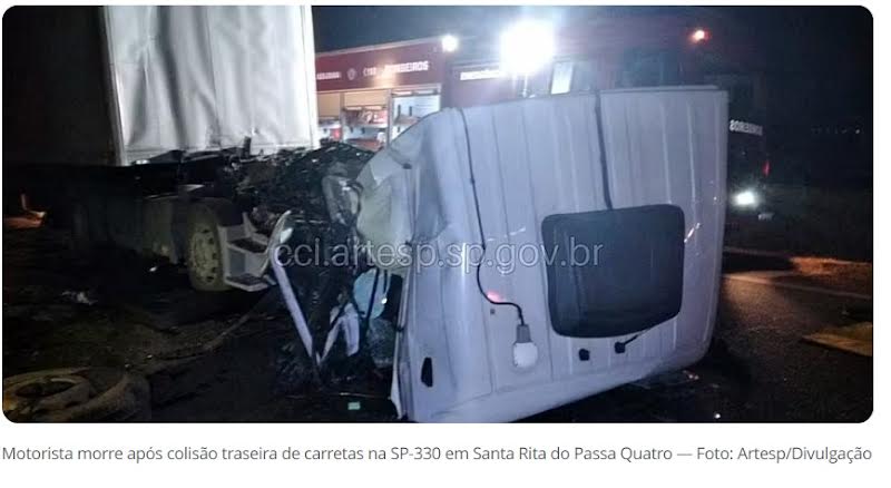 Um caminhoneiro morreu após uma colisão traseira entre duas carretas em Santa Rita do Passa Quatro (SP), na madrugada desta quinta-feira (25). O motorista foi socorrido pelo Corpo de Bombeiros e levado para o hospital de Porto Ferreira, mas não resistiu aos ferimentos. A identidade da vítima não foi divulgada.