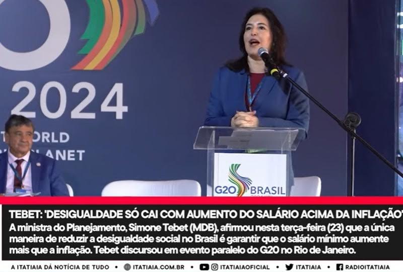 A ministra do Planejamento e do Orçamento, Simone Tebet (MDB), afirmou nesta terça-feira 23 que a única forma de reduzir a desigualdade social no Brasil é assegurar que o salário mínimo suba mais que a inflação. Tebet discursou em um evento paralelo do G20 no Rio de Janeiro sobre a erradicação da pobreza e da fome.