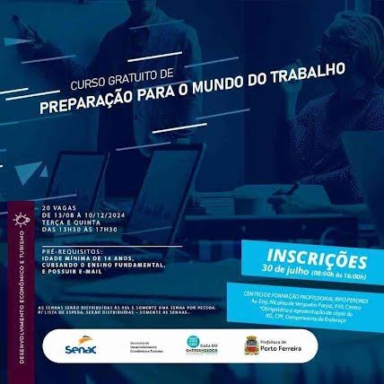 A Prefeitura de Porto Ferreira, em parceria com o Senac (Serviço Nacional de Aprendizagem Comercial), por intermédio da Secretaria de Desenvolvimento Econômico e Turismo, oferece vagas para o Curso de Preparação Para o Mundo do Trabalho, totalmente gratuito.