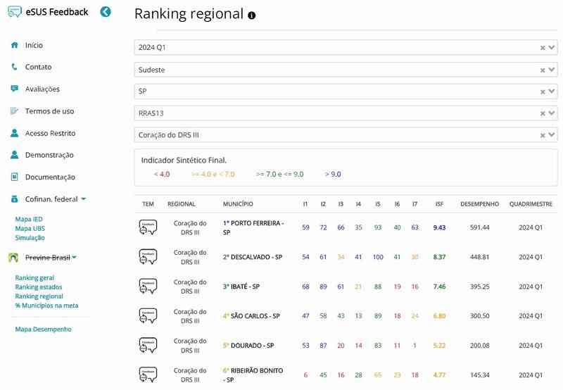 Entre as seis cidades do Coração da DRS-III, Porto Ferreira foi a única que atingiu mais de 90% no Indicador Sintético Final (ISF), com a nota 9,42. Depois seguem Descalvado (8,37), Ibaté (7,46), São Carlos (6,80), Dourado (5,22) e Ribeirão Bonito (4,77).