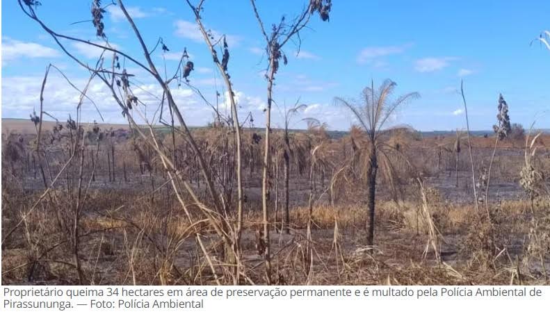 Um homem foi multado em mais de R$ 1 milhão por incêndio florestal em 34 hectares de área de preservação permanente, em Pirassununga (SP), na última quinta-feira (08/09).