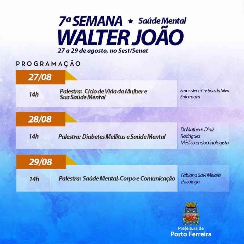 A Secretaria de Saúde de Porto Ferreira divulgou esta semana a programação da 7ª Semana de Saúde Mental Walter João, que acontece entre 27 e 29 de agosto, nas dependências do Sest/Senat, no Centro Empresarial Ferreirense (Cefer).