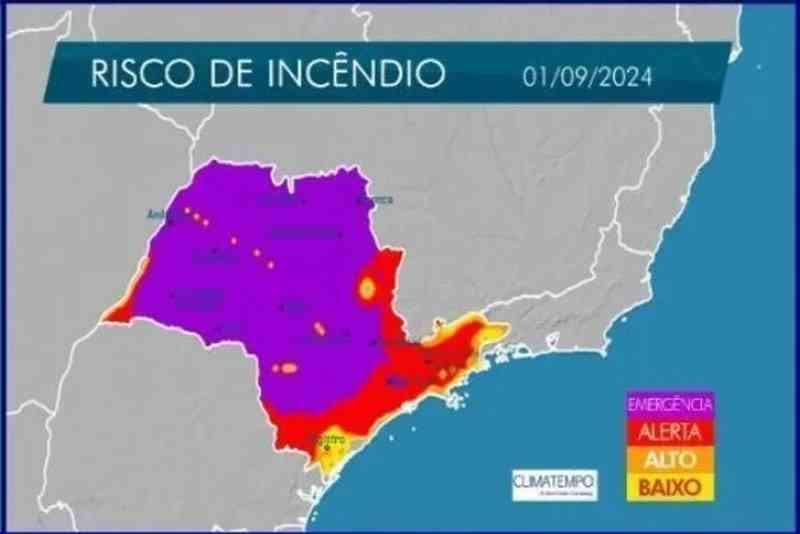 Um mapa (veja imagens no topo da reportagem) da Defesa Civil do estado de São Paulo aponta o aumento diário do risco de incêndios para status de alerta e emergência até o próximo domingo (1º). Com apenas a Baixada Santista de fora, praticamente todas as outras regiões de São Paulo terão risco máximo de alerta e emergência para incêndios. Os níveis são divididos entre risco baixo, alto, alerta e emergência. A partir desta quarta (28), a faixa de risco de emergência começa se expandir, de acordo com projeção.