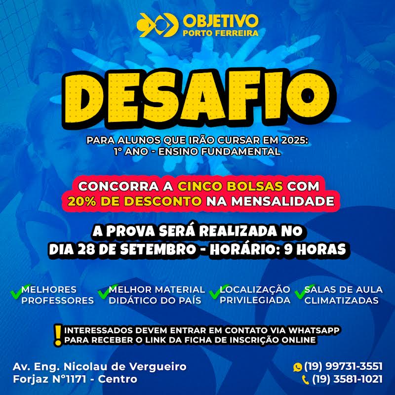 Se o seu filho vai iniciar o 1º ano do ensino fundamental em 2025, não perca a chance de concorrer a uma das 5 bolsas com 20% de desconto na mensalidade do Colégio Objetivo!