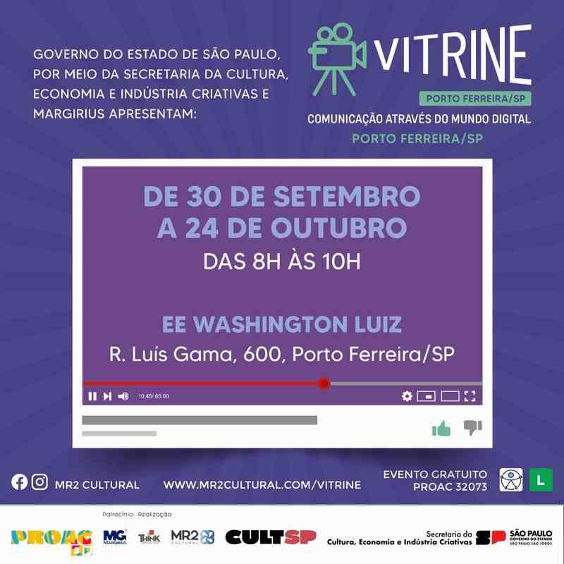 O projeto Vitrine – Comunicação através do Mundo Digital volta a Porto Ferreira com o objetivo de oferecer as ferramentas necessárias para que jovens de 14 a 16 anos possam criar suas próprias produções, por meio de oficinas gratuitas de audiovisual. Nesta edição, o projeto Vitrine contemplará 20 alunos da Escola Estadual Washigton Luiz, entre os dias 30/09 e 24/10. Já no dia 25/10, das 8 às 10 horas, será realizada a exposição dos trabalhos do participantes.