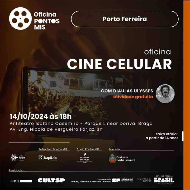O Projeto Pontos MIS, do Museu da Imagem e do Som de São Paulo, em parceria com a Secretaria de Cultura e Economia Criativa de Porto Ferreira, trará mais uma oficina ao município. Com o título “Cine Celular”, a atividade acontece na próxima segunda-feira (14/10), a partir das 18h, no Anfiteatro Isaltino Casemiro, localizado no Parque Linear Dorival Braga.