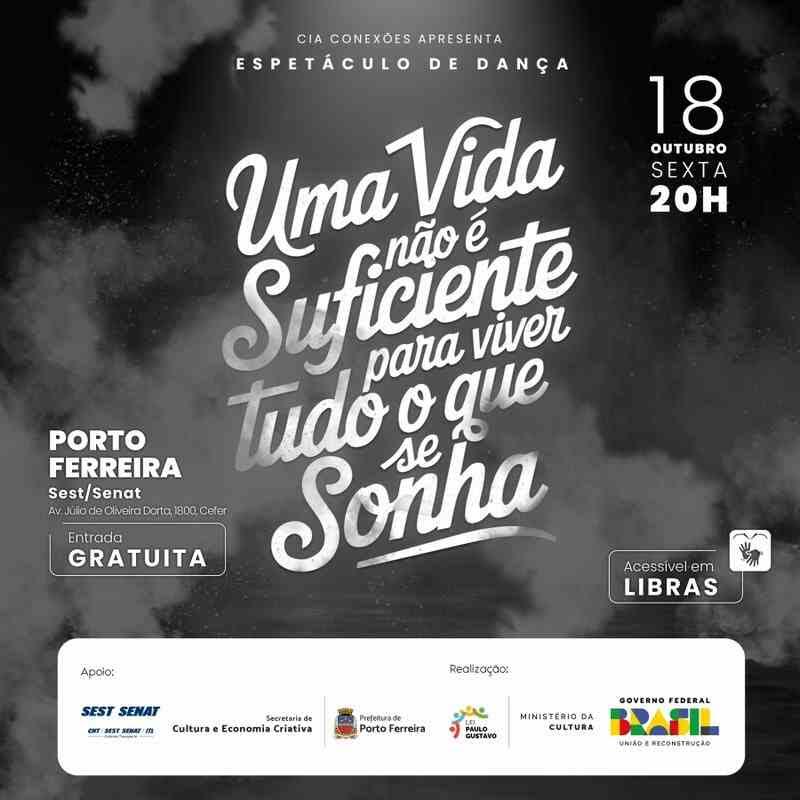 Nesta sexta-feira (18/10), a partir das 20h, a Cia Conexões trará ao público um espetáculo de dança no Sest/Senat de Porto Ferreira. O evento é parte do projeto "Uma Vida Não é Suficiente para Viver Tudo o que se Sonha", de Larissa Tereza Lamellas Borges Pirondi, financiado pela Lei Paulo Gustavo (Lei Complementar 195/2022).