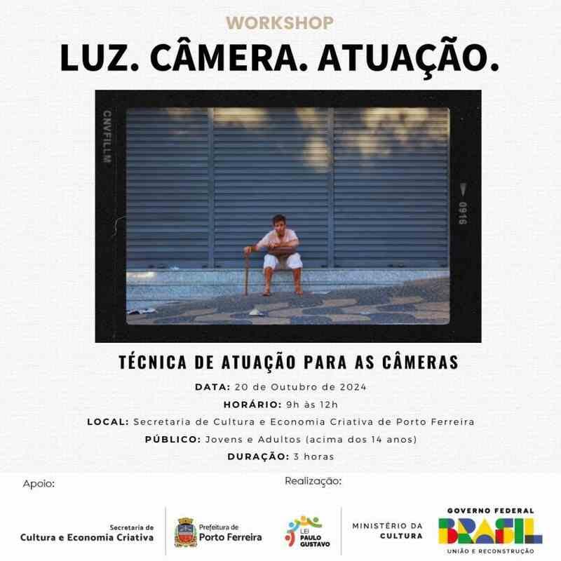 A Secretaria de Cultura e Economia Criativa de Porto Ferreira apresenta o workshop “Luz, Câmera e Atuação”, uma contrapartida de projeto financiado pela Lei Complementar 195/2022, a Lei Paulo Gustavo. A atividade é idealizada pelo proponente Bruno Henrique Prado Ferreira e aprovada no Edital 02/2024, oficializada pelo Termo de Execução Cultural nº 09/2024, recebendo R$ 27.500,00 do governo federal via prefeitura de Porto Ferreira para execução do projeto.