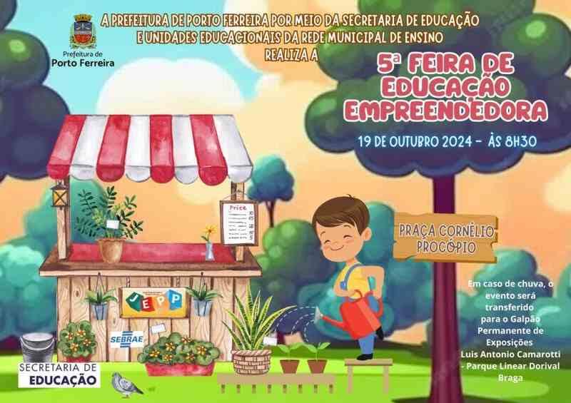 A 5ª Feira de Educação Empreendedora de Porto Ferreira será realizada neste sábado (19/10) na praça Cornélio Procópio (Matriz), no Centro. Alunos, professores, pais e cidadãos poderão conferir o trabalho realizado durante o ano letivo nas aulas de Empreendedorismo, que compõe a grade curricular do Ensino Fundamental e Médio, e adquirir diversos produtos produzidos pelos educandos da rede municipal de ensino.