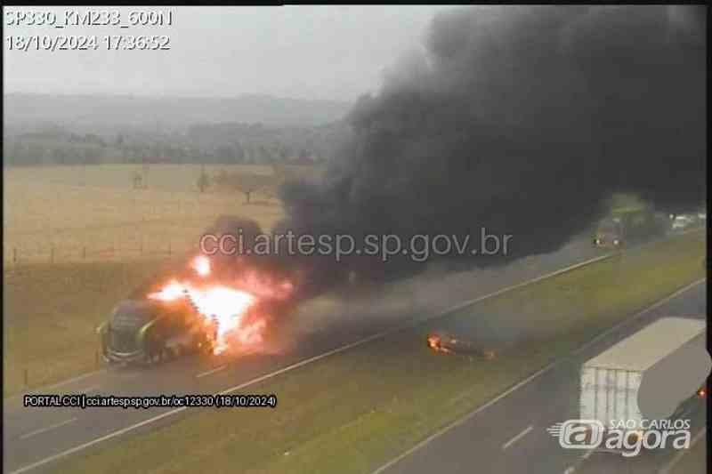 Um incêndio de grandes proporções consumiu o ônibus na tarde desta sexta-feira (18), na rodovia Anhanguera SP-330, em Santa Rita do Passa Quatro.