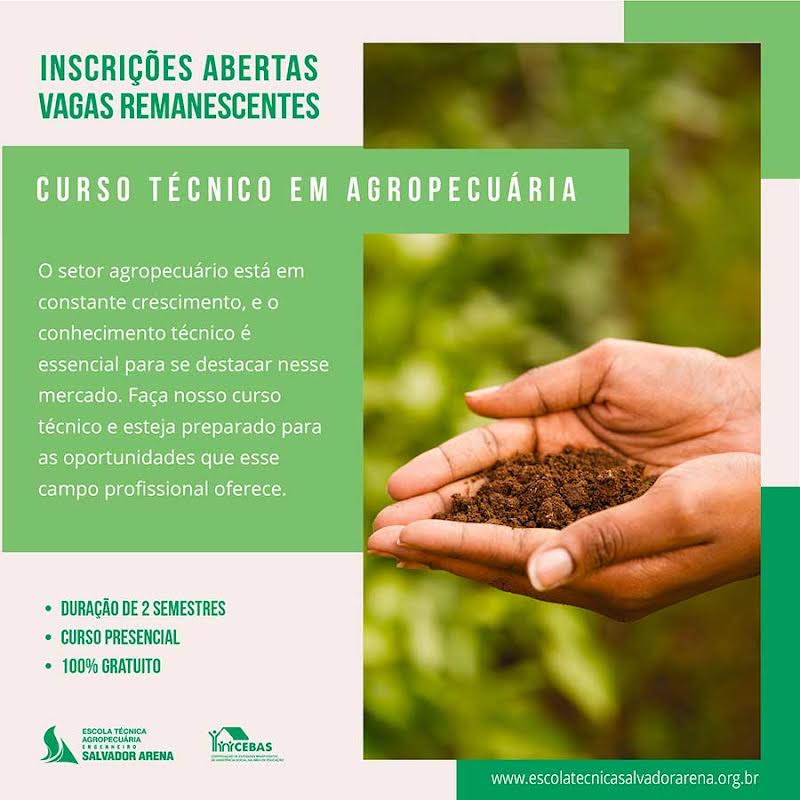 Sim, a Escola Técnica Agropecuária Engenheiro Salvador Arena (Etasa), localizada no município de Santa Rita do Passa Quatro – interior de SP, abriu as inscrições para a sétima turma no dia 20 de outubro de 2024. Podem se inscrever adolescentes, jovens e adultos de todo o país que tenham o ensino médio, mas não tenham concluído nenhuma faculdade.