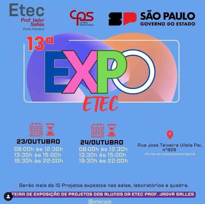 Começa hoje, quarta-feira (23/10) a “13ª Expoetec” da Etec Professor Jadyr Salles de Porto Ferreita