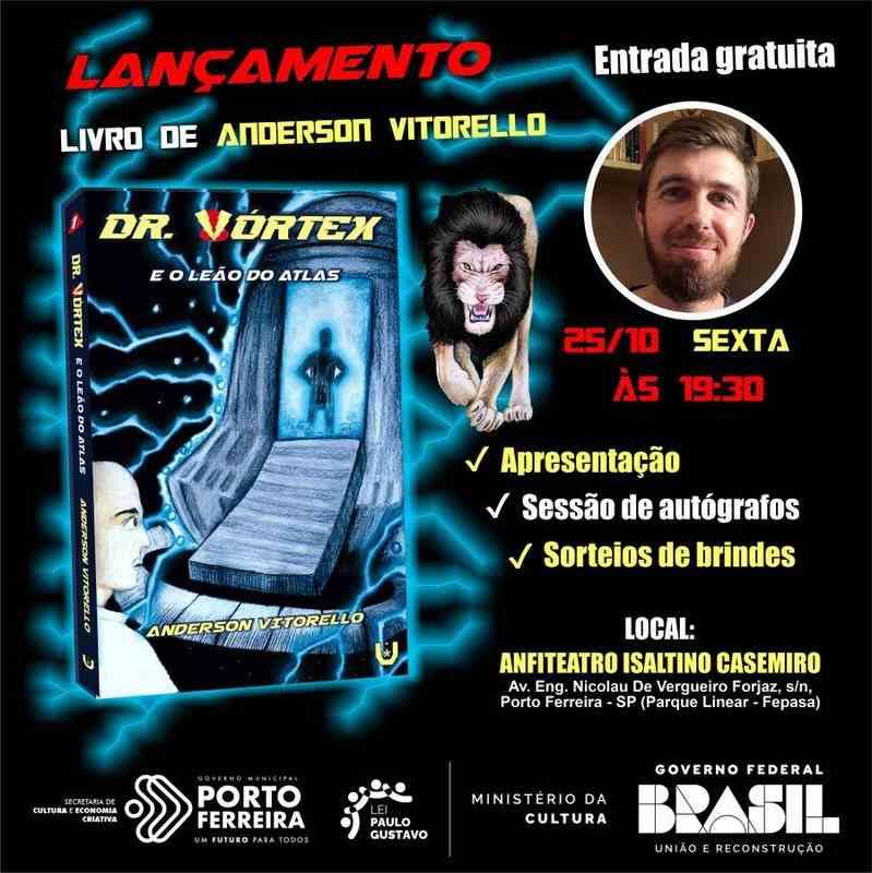 A Secretaria de Cultura e Economia Criativa de Porto Ferreira convida a todos para o lançamento da 2ª edição do livro “Dr. Vórtex e o Leão do Atlas”, uma das obras financiadas pela Lei Complementar 195/2022, a Lei Paulo Gustavo. O projeto, idealizado por Anderson José Vitorello, foi aprovado no Edital 01/2024 e oficializado através do Termo de Execução Cultural nº 03/2024., com financiamento de R$ 6.000,00 por parte do Governo Federal via Prefeitura de Porto Ferreira