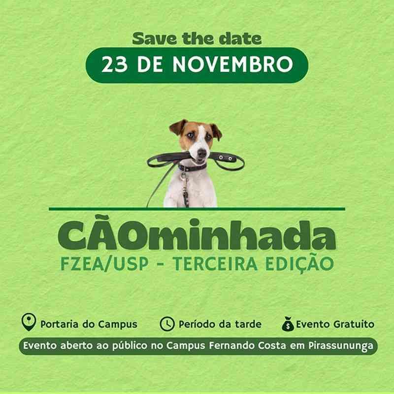 A Faculdade de Zootecnia e Engenharia de Alimentos (FZEA) da USP, em Pirassununga (SP), promove mais uma edição da Cãominhada, que ocorrerá no sábado, 23 de novembro, das 15h30 às 18h. O evento, gratuito e aberto ao público, terá como ponto de encontro a entrada do campus Fernando Costa, localizado na Rua Duque de Caxias Norte, 225, no Jardim Elite. Para maior comodidade, os participantes poderão utilizar o estacionamento disponível logo após a portaria.