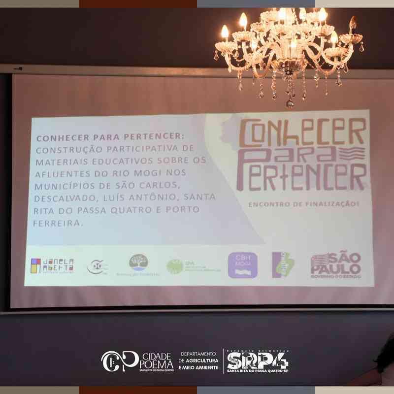 Na última quinta-feira (07/11) o município de Santa Rita do Passa Quatro recebeu a apresentação final e a entrega dos materiais do "Projeto Conhecer para Pertencer". Projeto esse coordenado pelo Instituto Janela Aberta e financiado com recursos da FEHIDRO, o qual contou com o levantamento da Microbacia do Corrégo Passa Quatro que drena o município.