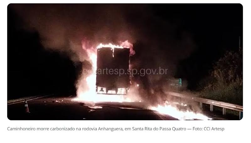 Um caminhoneiro de 23 anos morreu carbonizado após bater em outro caminhão, na madrugada desta quinta-feira (21), na rodovia Anhanguera (SP-330), em Santa Rita do Passa Quatro (SP).