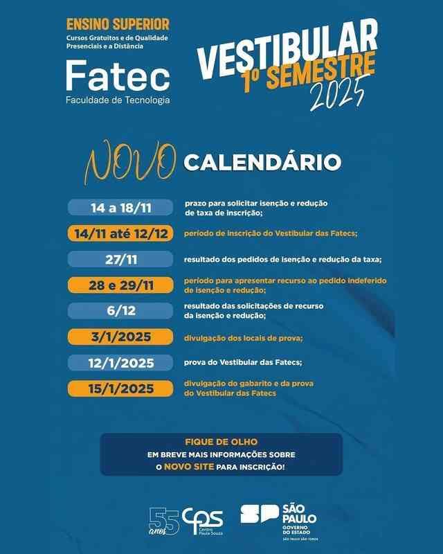 A Faculdade de Tecnologia do Estado de São Paulo (Fatec) abriu inscrições para o vestibular do primeiro semestre de 2025, inclusive em Porto Ferreira, onde a unidade está com suas obras em fase final.