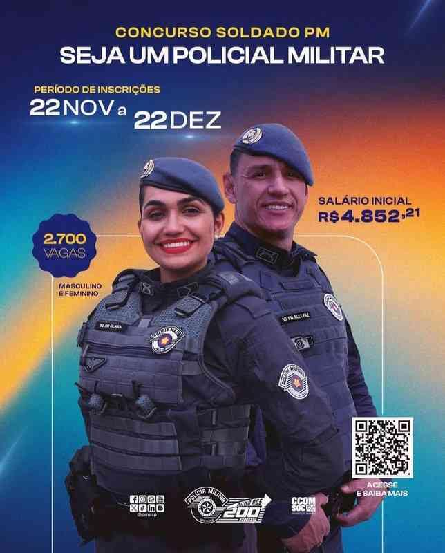 O Governo de São Paulo publicou no Diário Oficial do Estado edital para a contratação de 2,7 mil soldados de 2ª classe para a Polícia Militar (PM). As inscrições começaram na sexta-feira (22/11) e devem ser feitas pelo site Fundação Getúlio Vargas. O prazo termina em 22 de dezembro.
