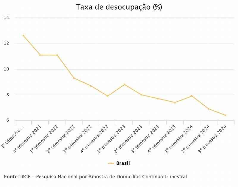 A taxa de desocupação no terceiro trimestre de 2024 caiu para 6,4%, de acordo com os dados da Pesquisa Nacional por Amostra de Domicílios (PNAD) Contínua, divulgada pelo IBGE nesta sexta-feira, 22 de novembro. Frente ao trimestre passado (que marcou 6,9%) a redução foi de 0,5 ponto percentual (p.p.). É o menor valor para um terceiro trimestre desde o início da série histórica, em 2012. Comparada ao terceiro trimestre de 2023 (7,7%), houve diminuição de 1,3 p.p.